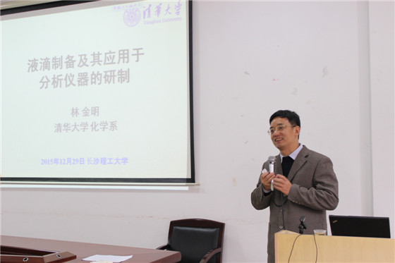 12月29日下午,应化学与生物工程学院邀请,国家杰出青年科学基金获得者、教育部“长江学者”特聘教授、清华大学化学系林金明教授来我校讲学,在云塘校区工科三号楼A-320作了题为《液滴制备及其应用于分析仪器的研制》的学术报告。学术报告会由院长杨荣华教授主持,副院长曹忠教授、朱志平教授,以及化学与食品相关学科的教师和研究生、应用化学专业本科生100余人聆听了林教授的精彩报告。