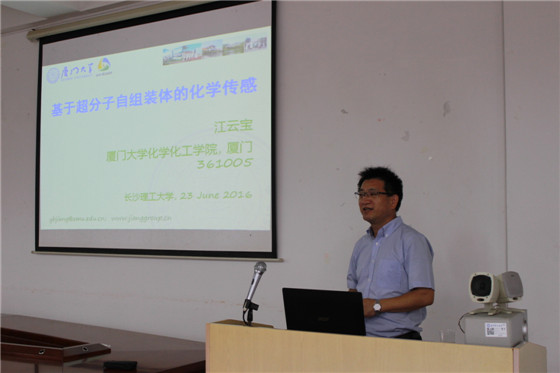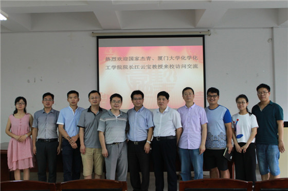 2016年6月23日,应太阳成集团tyc122cc入口化学与生物工程学院的邀请,国家杰出青年基金获得者、厦门大学化学化工学院院长、博士生导师江云宝教授来我校进行学术交流访问。学术交流活动由化学与生物工程学院院长杨荣华教授主持,副院长曹忠教授,肖忠良教授,以及化学、化工等相关学科的青年骨干教师、研究生、本科生100余人参加了此次学术交流活动。