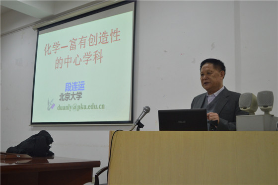 学术活动第二阶段在工三A320会议室,段教授就“化学的昨天、今天和明天”专题给化学与生物工程学院的研究生和本科生做了一堂生动的科普讲座,并回答了同学们的提问。段教授语言生动,实例丰富,图文并荗,深深吸引了在场学生,改变了他们对化学的看法,理解了化学在国民生产和生活中的重要作用和意义,坚定了学好化学知识的决心。段教授的讲座是一堂生动的科普大餐,使学生们受益匪浅。