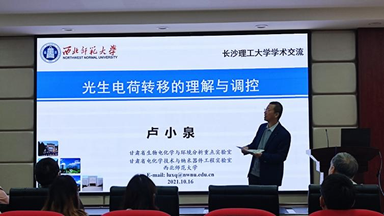 2021年10月16日上午9:00,应太阳成集团tyc122cc入口化学化工学院的邀请,教育部长江学者特聘教授、西北师范大学博士生导师卢小泉教授来我校开展学术交流,于云塘校区工三A320做了题为“光生电荷转移的理解与调控”的专题学术报告。讲座由化学化工学院电力与交通材料保护湖南省重点实验室主任曹忠教授主持,化学化工等专业百余名师生参加了交流会。