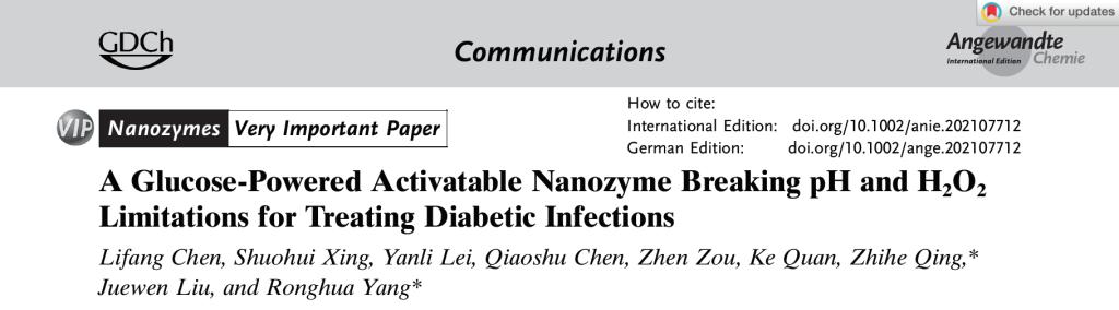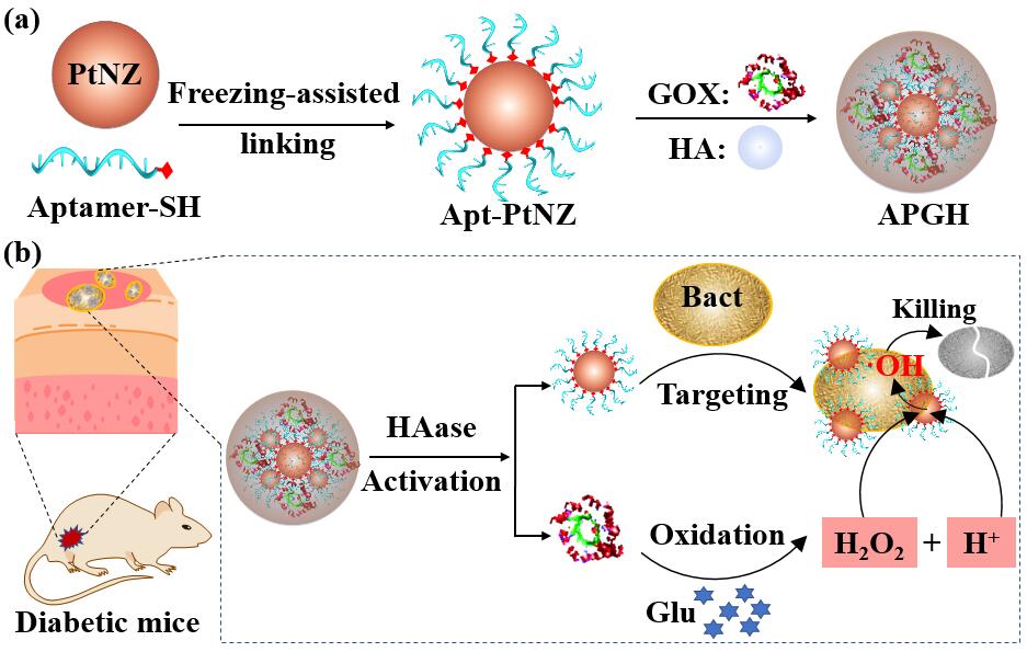首先,基于DNA探针在铂纳米颗粒表面的高稳定性修饰和高保真信号释放的前期研究基础(Zhihe Qing, et al. Angew. Chem. Int. Ed. 2020, 59, 14044-14048; Zhihe Qing, et al. CCS Chem. 2020, 2, 1217–1230),卿志和博士课题组发展了一种细菌感染激活的纳米酶,在生理条件下同时打破局部pH和过氧化氢的限制,提高慢性伤口部位的抗菌效果。选取糖尿病伤口感染为研究模型,以DNA分子(细菌特异性核酸适体)功能化的铂纳米酶、葡萄糖氧化酶和透明质酸为组装单元,构建透明质酸酶(HAase)激活的纳米酶胶囊(APGH)。APGH在受感染的伤口中被细菌分泌的透明质酸酶激活,之后纳米酶通过表面修饰的核酸适体与细菌结合,葡萄糖氧化酶催化糖尿病伤口中高浓度的葡萄糖氧化,降低pH,补充过氧化氢,铂纳米酶在细菌表面原位生成·OH,提高了化动力学杀菌效果。APGH的活性转化与抗菌作用在体外实验和糖尿病伤口抗菌实验中得以验证。这种通过调控生理微环境以增强纳米酶活性的策略具有通用性,对促进纳米酶的生物学应用具有重要意义(Scheme 1)。该工作以“A Glucose-Powered Activatable Nanozyme Breaking pH and H2O2 Limitations for Treating Diabetic Infections”为题,于2021年8月10日发表在国际化学领域顶刊Angewandte Chemie,并入选VIP论文(Very Important Paper)和封面成果(Frontispiece),并被期刊官媒作新闻(News)报道。文章共同第一作者是太阳成集团tyc122cc入口硕士生陈丽芳、硕士生邢硕晖和雷艳丽博士,通讯作者是卿志和副教授和杨荣华教授。文章链接:https://onlinelibrary.wiley.com/doi/10.1002/anie.202107712。