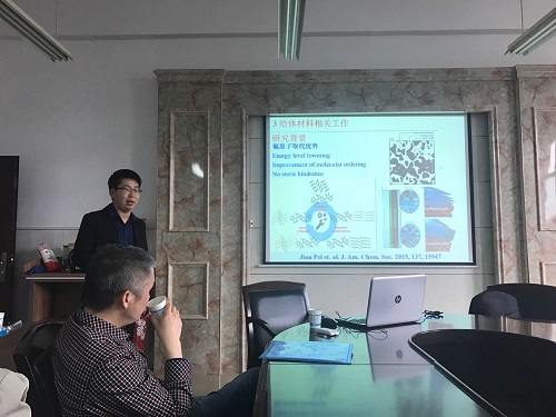 袁博士的报告题目为“高效太阳能电池的材料设计、合成与光伏性能研究”。有机太阳能电池是一种将太阳能转换为电能的新型电子器件,因其制备成本低、光电特性易调节、可制成半透明以及可大面积卷对卷印刷等优点,已成为目前研究的热点。衡量太阳能电池性能的主要指标是其能量转换效率。高效率有机太阳能电池仍然是目前研究的首要目标,也是实现其产业化的关键。