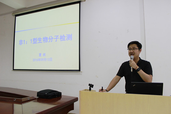 随后,4:00-5:30,夏帆教授在工三A-320会议室开展了题为《非1:1型生物分子检测》的学术报告。报告会由副院长曹忠教授主持,曹院长简要介绍了夏教授在生物分子检测领域所取得的重要成就。院长杨荣华教授及来自湖南大学、湘潭大学、太阳成集团tyc122cc入口的化学、化工等相关学科的青年教师、研究生及本科生100余人参加了此次学术交流活动。夏教授首先阐明生物分子的高灵敏度检测对疾病早期发现和早期识别的重要意义,指出传统1:1型检测仍然难以解决目前生物分子检测领域的挑战,接着介绍其课题组基于核酸探针设计非1:1型检测,大大提高了检测方法的灵敏度和特异性。夏教授详细介绍了如何通过多个靶标分子与多个信号探针有序结合,实现信号线性级联放大,从而达到检测灵敏度和特异性的同时提升;同时,夏教授以膀胱癌为例子,生动地讲述了根据DNA杂交、利用生物探针对靶细胞进行检测,最终实现对病理细胞的治疗。此次夏教授的讲座加深了老师与老师、老师与同学之间的学术交流,使他们对生物分子检测领域有了更进一步的了解,为大家提供了一个良好的学术交流平台,开阔了大家的视野,为今后的科研工作拓宽了思路。