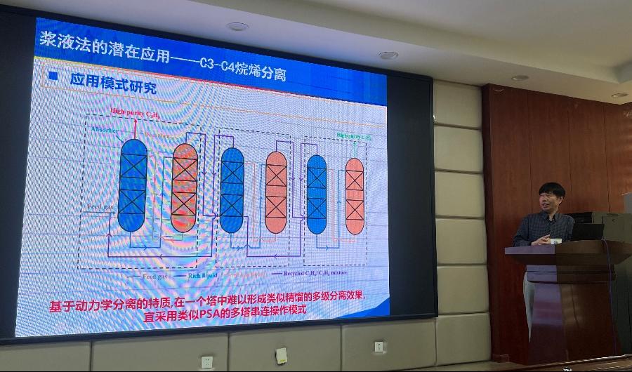 陈光进教授从MOF材料用于气体分离面临的挑战出发,提出了多孔浆液法——吸收吸附耦合分离技术,详细介绍了液膜分离技术的原理、特点、优势以及应用前景,并阐述了液膜分离技术在脱碳、CH4/H2、CH4/N2、C2H6等体系的潜在应用及预期能耗。报告结束后,陈光进教授与师生开展了热烈的讨论,陈教授鞭辟入里地回答了老师们的问题,现场气氛活跃。陈光进教授的学术讲座不仅拓宽了师生们的研究视野,也对我校化工、化学、材料科学等相关领域的学术研究与发展起了积极的推动作用。
