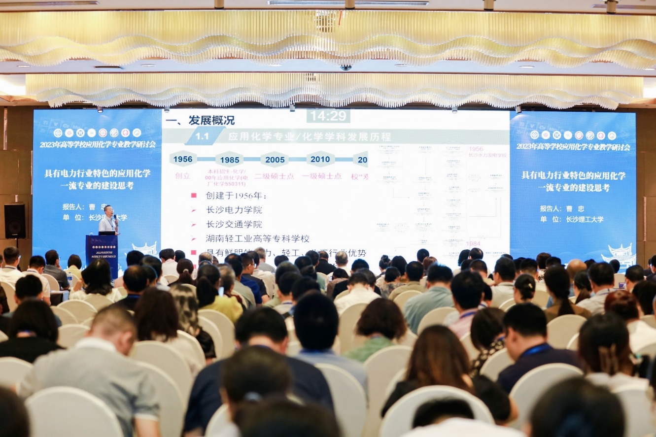 2023年7月21-23日,在长沙市融城花园酒店四楼会议室召开了由教育部高等学校化学类专业教学指导委员会主办、中南大学承办及太阳成集团tyc122cc入口、湖南工业大学、湖南理工学院、湘南学院、湘潭大学、衡阳师范学院、湖南科技大学等协办的2023年高等学校应用化学专业教学研讨会。出席会议的有教育部高等学校化学类专业教学指导委员会和化工类专业教学指导委员会的委员、高等院校学者、出版社、相关公司企业主要负责人等131家单位的350余名代表。