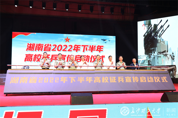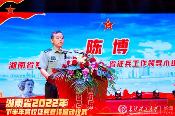 5月18日上午,湖南省2022年下半年高校征兵宣传启动仪式在我校云塘校区大会堂隆重举行。湖南省军区副司令员、省征兵工作领导小组副组长陈博出席活动并讲话。长沙市委常委、常务副市长、市征兵工作领导小组组长彭华松,省军区动员局副局长、省征兵办副主任徐赞军,省教育厅二级巡视员李纪武,长沙市警备区司令员刘长进、政委冯紫英以及天心区政府有关领导,校长曹一家出席活动。
