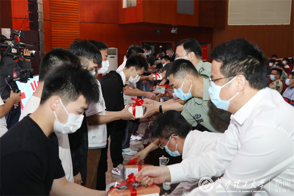我校优秀退役大学生士兵代表蒋利杨与学生代表分享了自己的军旅感悟。应征报名毕业生代表王雨奇号召大学生们携笔从戎、保家卫国。