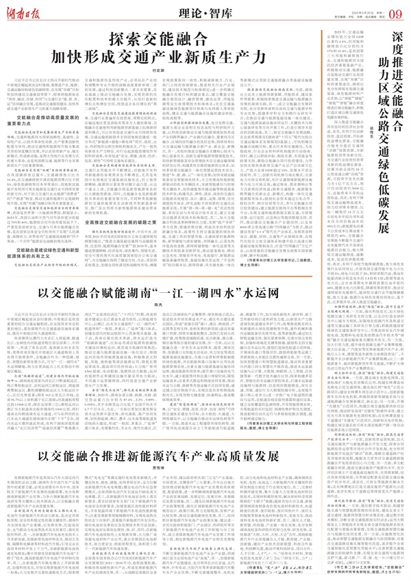 交通是兴国之器、强国之基,能源是立国之本、安邦之道。交通运输和能源行业在国家发展全局中具有基础性、先导性、战略性作用。深入推进交通运输与能源融合发展,是服务国家重大战略、支撑经济社会平稳发展的重要举措,是保障国家能源安全、构建大安全格局的现实需要,也是加快发展新质生产力,扎实推进高质量发展的必由之路。5月20日,《湖南日报》理论智库版整版刊发我校4位专家学者的理论文章,从《探索交能融合 加快形成交通产业新质生产力》《深度推进交能融合 助力区域公路交通绿色低碳发展》《以交能融合赋能湖南“一江一湖四水”水运网》《以交能融合推进新能源汽车产业高质量发展》为推动交能融合发展集智献策。
