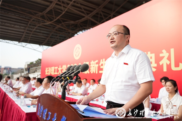 新生代表、土木工程学院2024级本科生胡博洋发言。他向关心支持他们的师长和亲友致以感谢,表示将牢记“博学、力行、守正、拓新”的校训,胸怀理想、锤炼本领、追求卓越,为长理增光添彩,为强国建设贡献力量。