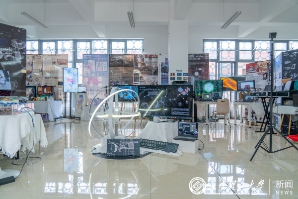 展览现场,艺术学院教师书画作品同期展出充分展现学院教学相长的艺术生态数字媒体艺术展区汇集众多数字交互作品;视觉传达设计展区通过动态视觉、品牌升级文化衍生等多元形式重构城市文化符号;环境设计团队将老城区改造方案搬进展厅;工艺美术专业以釉色流淌诉说千年窑火新声;影视摄影与制作展区更以4K影像记录时代脉搏。展览特别设置数字互动专区,通过科技与艺术的创新融合让现场观众实现与数字艺术的深度对话