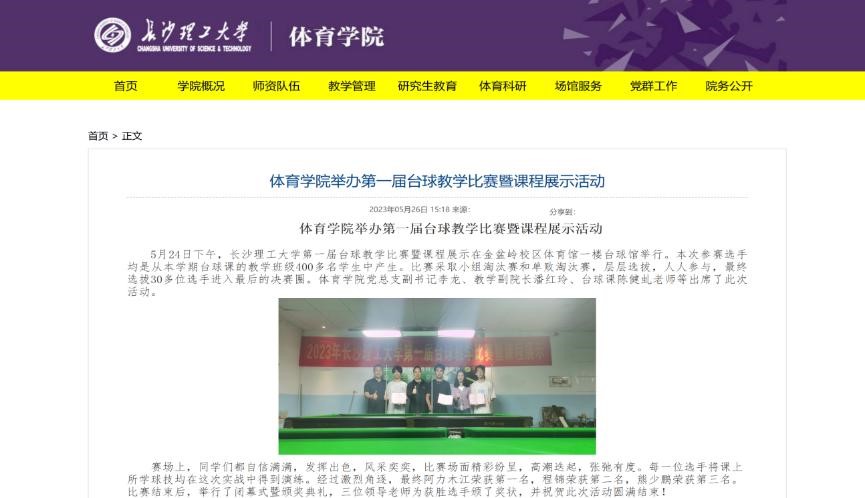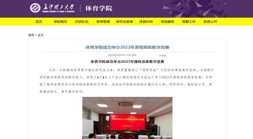 体育教学改革不断深入。深入贯彻落实全国教育科学大会精神,以新时代学校体育“四位一体”目标为导向,制定了《“1234”模式体育课程体系改革方案》,开设深受学生喜爱的体育课程项目 30 余项,已完成“国家精品视频体育课程”1 项,《排舞》获批湖南省“一流”课程,已完成和在建 10 余门校级“金课”,编写学校优秀体育教材《大学体育模块教程》,获立省教研教改项目 10 余项,4 位教师在湖南省普通高校青年体育教师课堂教学竞赛中分包或一、二、三等奖,获校优秀教学成果一等奖1项、二等奖 2 项、三等奖 2 项。