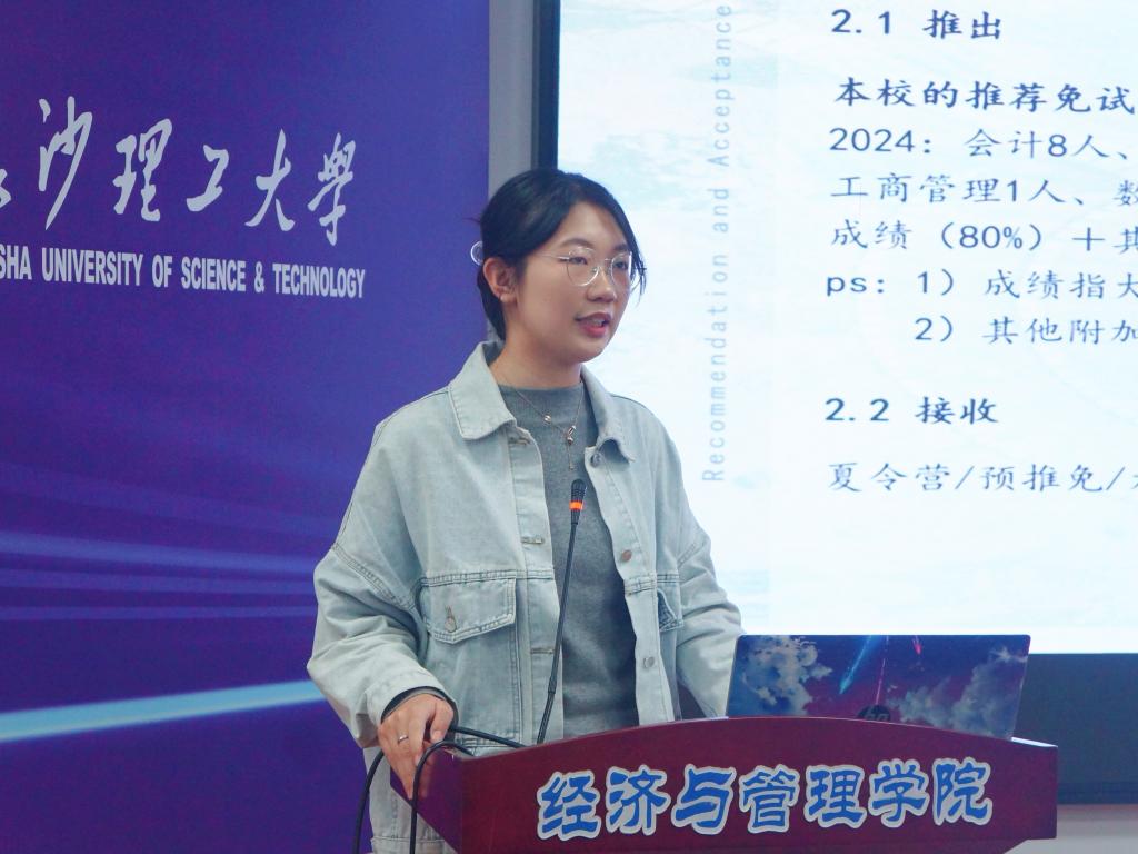 七位优秀保研学生代表结合个人经历,从保研政策、保研流程、课程学习、学校选择、学科竞赛等方面进行了分享。保研至中央财经大学的ACCA2101班姚雁琼重点分享了自己的学科竞赛经验。保研至华南师范大学心理学专业的人资2101班雷真强调学科交叉融合,鼓励同学们形成综合性思维。保研至中南财经政法大学的会计2104班彭诗婷重点分享了夏令营和面试的经验,表示要学会充分利用个人优势,力争在夏令营和推免面试中占据优势地位。保研至深圳大学的数字经济2101班徐枫强调了计算机使用技能的重要性,并解答了学校保研政策与具体流程。