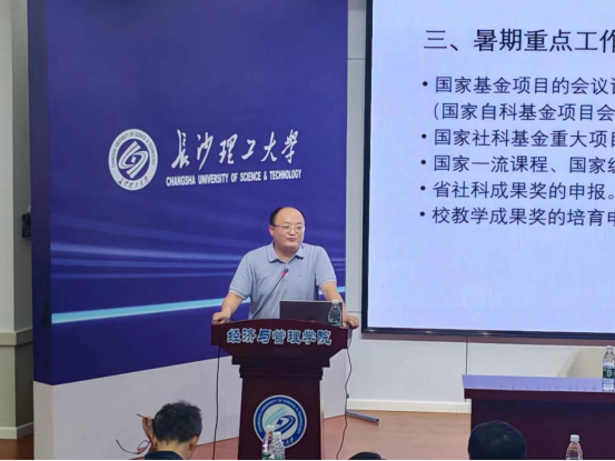 彭新宇对上半年行政工作进行总结,全面回顾了学院在教学科研、专业建设及人才培育等方面所取得的成果与亮点,他指出,在学校年度党政工作要点和学院年度重点任务的指导下,在全院师生的共同努力下,本学期学院各项工作扎实开展,对全院师生一学期以来的辛勤付出表达感谢,同时强调要认清学院在教学管理、研究生学位论文质量管理、EDP培训项目等方面存在的不足以及教学团队建设、奖励性绩效分配改革等一些推进较缓慢的工作,并对国家基金项目的申报与评审、省社科成果奖和校教学成果奖申报等暑期重点工作进行提示。
