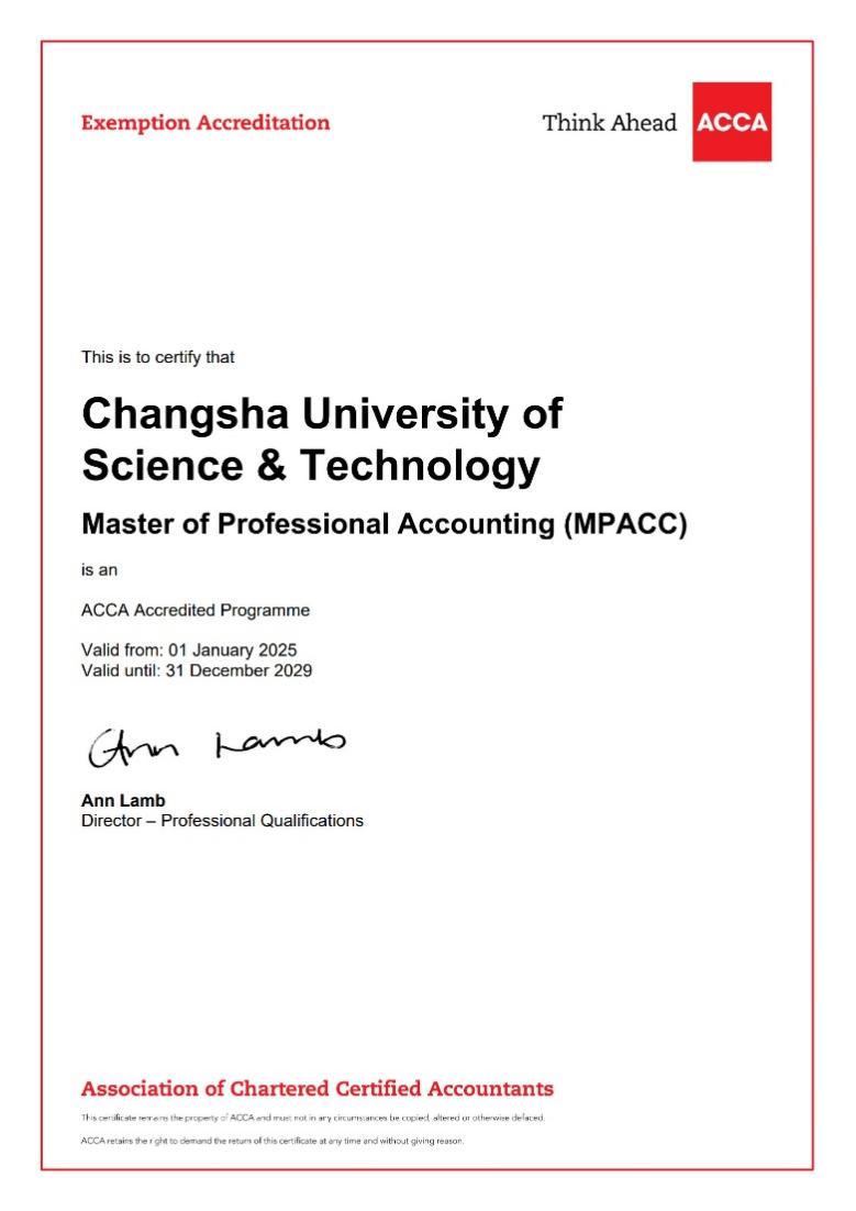 近日,太阳成集团tyc122cc入口会计硕士专业学位(MPAcc)项目通过了特许公认会计师公会(ACCA)总部的免试审核,成为湖南第二所获得此项认证的高校。在2025年1月1日至2029年12月31日期间太阳成集团tyc122cc入口会计硕士专业学位(MPAcc)项目的毕业生,在获得硕士学位后,将享有免考特许公认会计师公会(ACCA)认证的九门课程的资格。