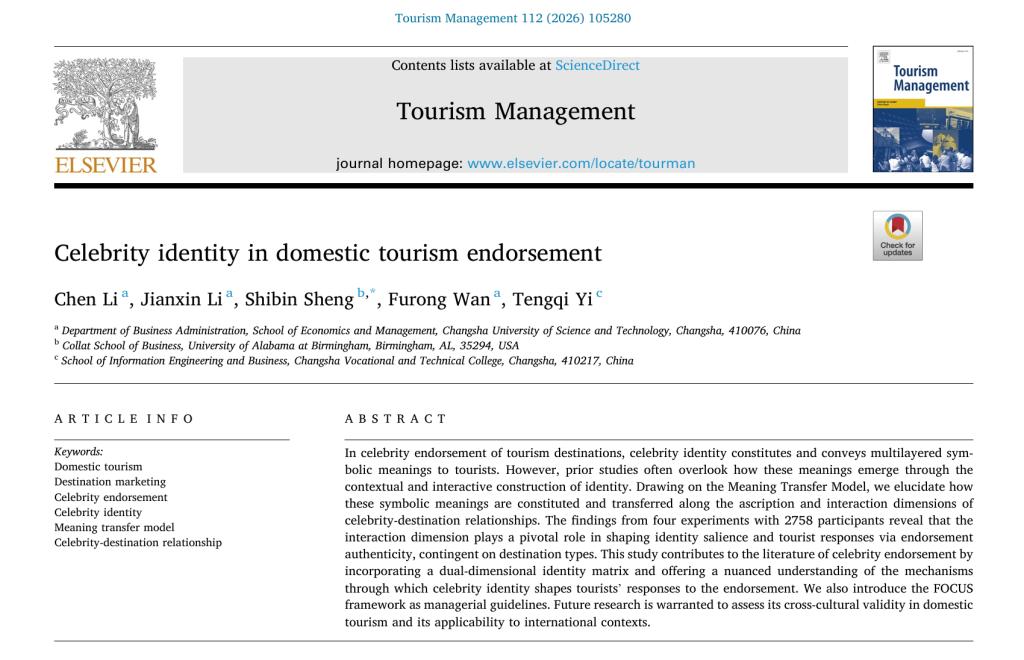 近日,我院博士生李晨作为第一作者与黎建新教授(导师)、美国阿拉巴马大学伯明翰分校盛仕斌教授(通讯作者)以及博士生万芙蓉、易腾麒合作撰写的论文“Celebrity identity in domestic tourism endorsement”在旅游国际期刊《Tourism Management》在线发表,将正式刊发于2026年2月112卷号。该文链接及DOI:https://doi.org/10.1016/j.tourman.2025.105280。