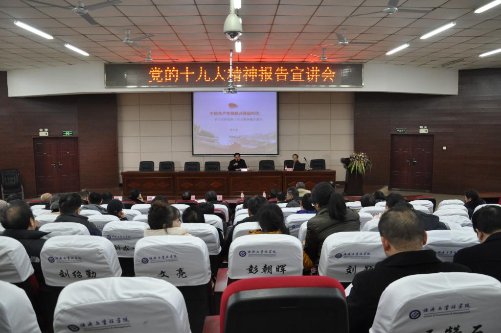 1月9日下午,根据学校统一部署,校“学习宣传贯彻党的十九大精神宣讲团”在经管学院举行宣讲报告会。宣讲团成员、土木学院党委书记张可荣作专题报告,经管学院全体教职工聆听了报告会。学院党委书记王宏主持报告会。
