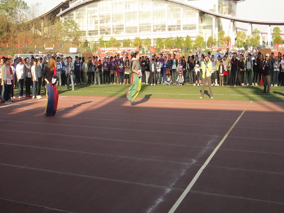 开幕式正式开始,各学院方阵依次入场。第二个入场的经管学院方阵用女生阵容以及激昂的啦啦操展现了经管学院的魅力与风采,彰显了对比赛的热情与信心,赢得了全场的喝彩。随后进行了庄严的升国旗仪式,校长赖明勇致辞,运动员代表及裁判代表宣誓。