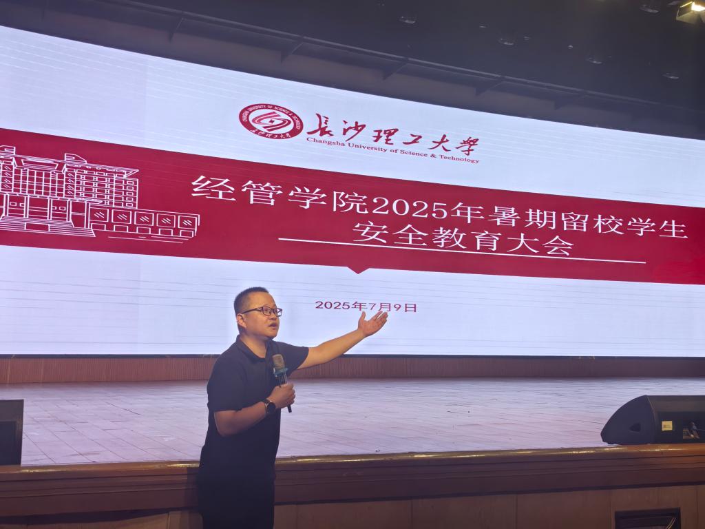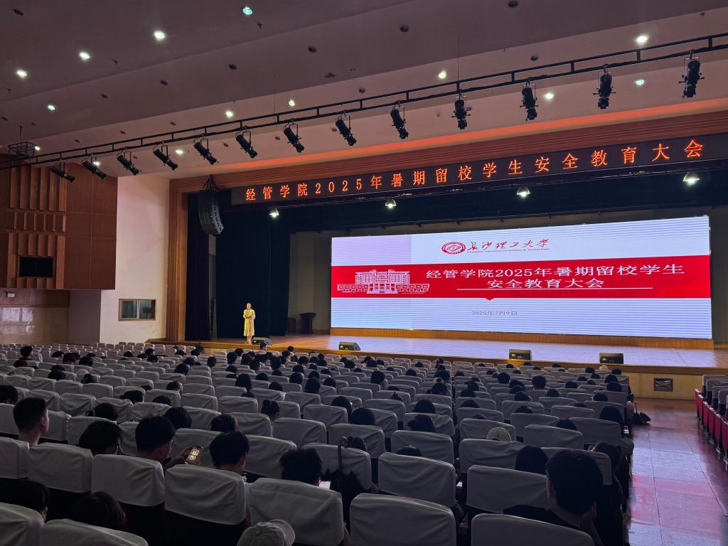 7月9日晚,经管学院在五教大礼堂召开2025年暑期留校学生安全教育大会。学院党委副书记汪功伟、辅导员王宝宝、庄行宜、叶鑫、吴畏和助理辅导员孔鼎森参加会议。