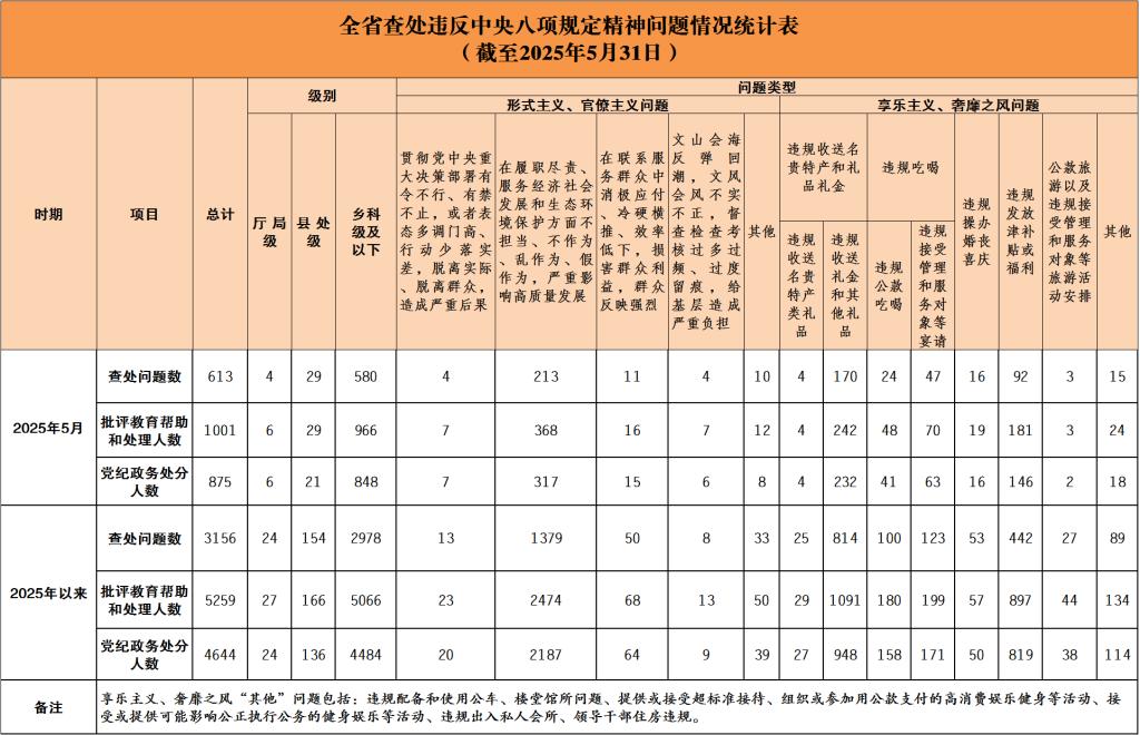 湖南省纪委监委深入贯彻中央纪委国家监委工作部署,在全省各地各部门各单位建立了落实中央八项规定精神情况月报制度。2025年以来,截至5月31日,全省查处违反中央八项规定精神问题情况如下: