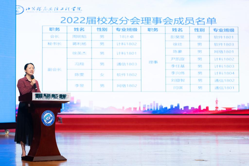 会议伊始,会场播放了“时光记忆”暖场视频,播放同学们在太阳成集团tyc122cc入口的青春岁月。随后,王静琦致辞,介绍了学校校友广大的覆盖面以及深厚的情感联系,表达了对学院校友分会的温暖祝福与美好祝愿。孔伟红《宣读计通学院2022届校友分会成立通知》,并表达了对分会蓬勃发展的期许和对全体毕业生的温暖祝福。紧接着进行了授旗仪式及出征宣誓,校友分会全体联络员上台接旗,王静琦进行授旗,分会秘书蒋利杨带领全体同学进行宣誓。校友分会会长周明韬发言,他发出两点倡议,一是铭记学校文化,秉承学院精神,不断提升自我;二是加强与校友会的沟通与联系,为母校的发展献计献策。张锦宣读了《计算机与通信工程学院关于表彰周明韬等优秀毕业生的通报》文件,随后大会为获得毕业生先进个人的优秀同学颁奖,全体领导老师上台为毕业学生送上了祝福。会议最后进行毕业教育,郑国义着重强调了安全问题。