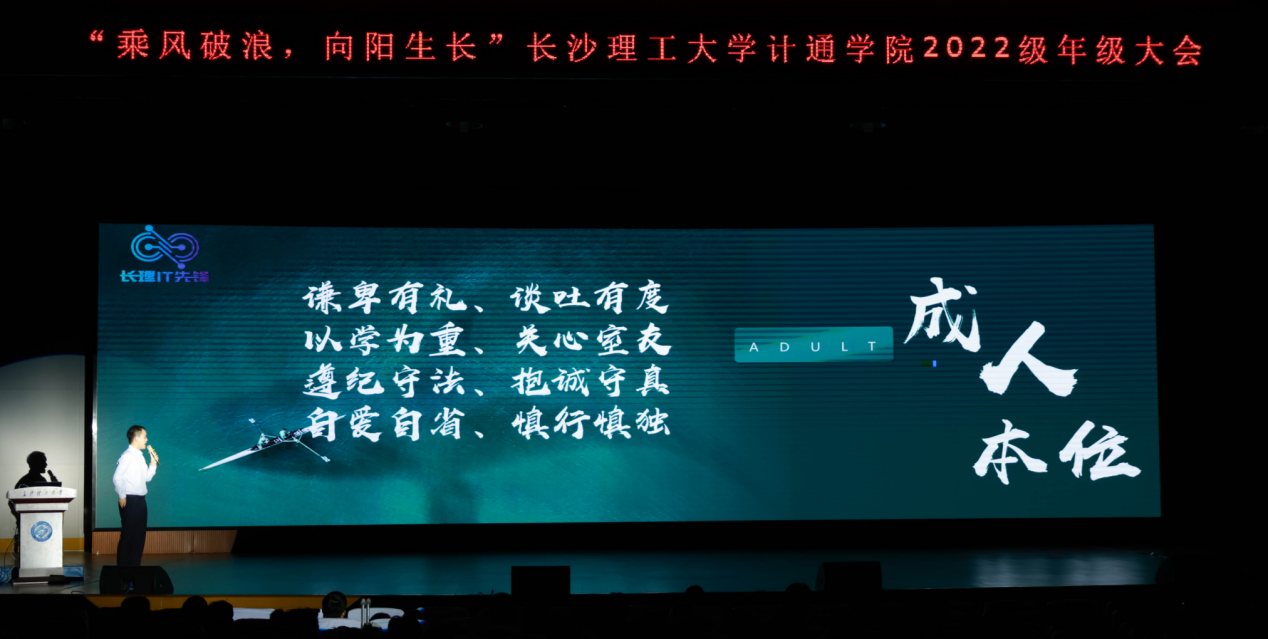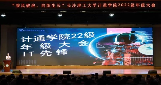 517日晚,计通学院在金盆岭校区5教大礼堂顺利召开2022级本科生年级大会。本次会议以“乘风破浪,向阳生长”为主题,院党委副书记王觊婧、22级辅导员唐菲楠出席,22级辅导员余泽宇主持,2022级全体本科生参会。