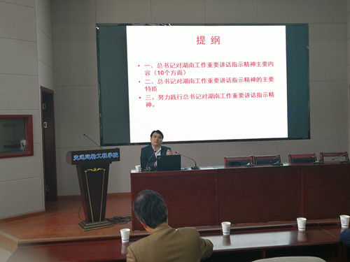 为认真落实省委巡视组关于巡视我校的反馈意见,深入贯彻落实习近平总书记关于湖南工作的讲话精神,3月19日下午,交通学院举办《深入学习贯彻习近平总书记关于湖南工作讲话精神专题报告会》,报告会由我校马克思主义学院党委书记易显飞教授主讲,院党委副书记田上主持,全院教职工参加。