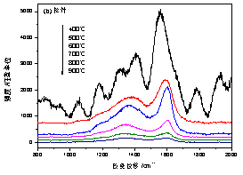 在本项目的研究中,生物质原样和低温(200和300℃热解)焦炭的拉曼光谱遇到强荧光干扰,未能获得有效谱图。荧光干扰也是可见激光拉曼光谱测试时遇到的难题之一。建议后来的研究者改用近红外激光源的拉曼光谱进行测试,可避免荧光干扰。