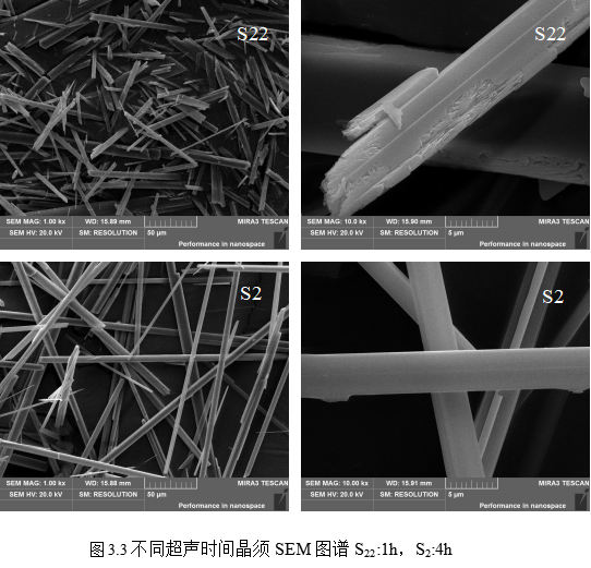 超声时间较长的晶须产品比超声时间较短的晶须产品长径比更大,表面更光滑无裂纹,且结晶度更好。经测量得超声1h的产品的长径比为31.80,超声时间为4h的产品长径比达到35.71。