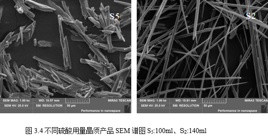 由图3.2可以看出,本体系制得的硫酸钙晶须表面光滑,结晶度较好。低浓度硫酸制得的晶须产品长径比更大且末端更光滑。样品S1、S2、S4的长径比分别为55.56,33.33,35.71。