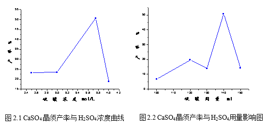 H2SO4浓度对硫酸钙晶须的产率有很大影响,H2SO4浓度过大或过小对产物的产率均不利。在本体系中,最佳H2SO4浓度为3.6mol/L-3.8mol/L。硫酸钙晶须的产率随着硫酸的用量先增大后减小,最佳用量为140mL。