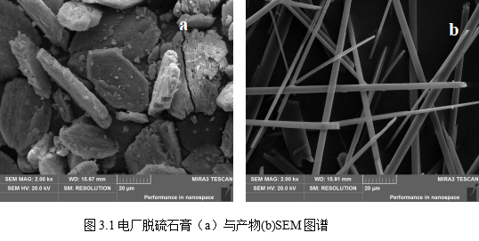 图3.1(a)显示电厂脱硫石膏呈不规则的片状,直径在20-40μm。图3.1(b)是以硫酸浓度为3.0mol/L所制得的硫酸钙晶须的SEM图,由图可以清楚地观察到以超声法制备的样品形貌为一维晶须,长度均一,且晶须表面非常光滑,长比约为50。