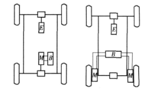 动力耦合装置实现对不同动力源的整合输出有三种可选的合成方式,即:转矩合成模式、转速合成模式和功率合成模式。其中功率合成模式可以自动适应转速,而且在动力切换的同时不产生明显的冲击,所以更具有优越性而被广泛使用。利用功率合成模式制造出的混合动力汽车,混合动力的工程机械,以及多源动力的军用机械都有很好的应用。混合动力电动汽车动力耦合装置按其布置形式的不同可分为分散耦合和集中耦合两大类。其中分散耦合,是说混合动力电动汽车上的发动机和电动机都有各自的传动线路,两者不干涉,分别将自己的动力通过独立的线路传给汽车的驱动轮。分散耦合根据其结构不同还可以细分为两种模式,中置电机式和轮毂电机式,如图2.1所示。中置电机式需要特定的差速器和与之匹配的驱动桥才能实现功能,相对结构复杂成本高,不利于使用;而轮毂电机的结构较为使用,但是受制于轮毂电机的设计生产,由于车用轮毂电机没有完全推广,它的应用也比较少。