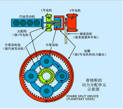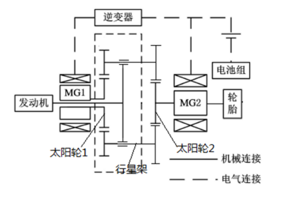 发动机提供主要的动力,拖动行星架转动,同时带动太阳轮1和太阳轮2。太阳轮1带动MG1为发电机给电池充电,行星轮再将动力传给太阳轮2输出。MG2为电动机,提供起动扭矩。其中,发动机扭矩的70%分配到行星轮上再经太阳轮2传递到车轮,30%分配到太阳轮1上并驱动MG1发电,而大部分的起动扭矩来自MG2