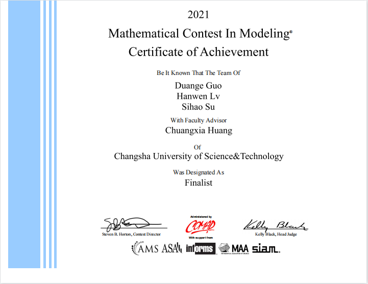 近日,2021年美国大学生数学建模竞赛结果正式公布。我校共获得特等奖提名奖(Finalist)1项和二等奖(Honorable Mention)6项的好成绩。数学与统计学院黄创霞教授指导的郭端格、吕翰文、苏思浩3名同学组成的代表队获得此次竞赛的特等奖提名奖, 实现了学校在此项比赛上的突破。