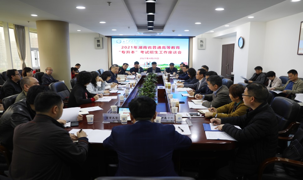 4月28日,湖南省普通高等教育“专升本”考试招生工作座谈会在我校召开。湖南省教育厅党组成员工委委员左清、省教育厅高教处处长曾力勤、省教育厅高教处副处长周军、省教育厅二级调研员张琳及湖南省20所院校分管领导及教务处负责人参加会议。