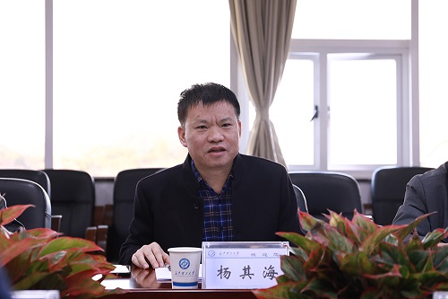 刘朝晖校长对杨其海一行来我校调研指导工作表示欢迎,并简要介绍了我校的产业链人才队伍建设基本情况。
