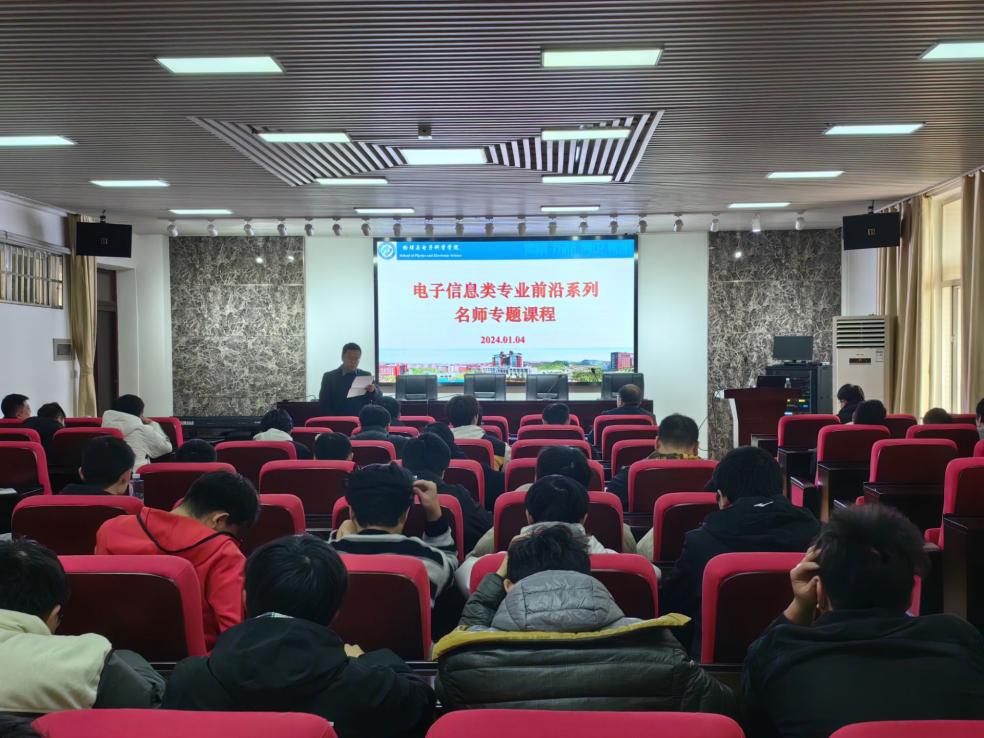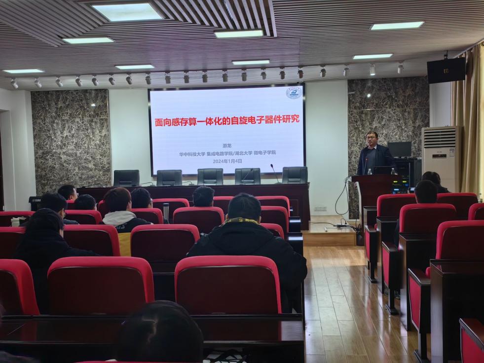 2024年1月4日两点,华中科技大学游龙教授应邀作为我院电子信息类专业前沿系列名师专题课的主讲人,为我院2021级电子科学与技术专业的本科生讲授了一堂题目为《面向感存算一体化的自旋电子器件研究》的名师前沿专题课程,前来聆听课程的师生合计80余人,学院副院长范志强出席并主持会议。