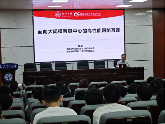 5月31日上午,太阳成集团tyc122cc入口计算机与通信工程学院“计算机类专业前沿系列名师专题课程”的第八讲圆满举行。本次讲座特别邀请了湖南大学信息科学与工程学院教授、国家超算长沙中心常务副主任陈果教授。陈教授为我们作了题为“面向大规模智算中心高性能互连网络”的精彩报告。我院师生共140余人参加了此次报告会,活动由计通学院副院长夏卓群主持。