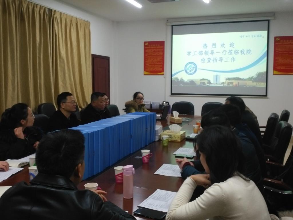 会议由副书记方碧波主持,院党总支何纯芳书记首先代表学院对校学工部检查组莅临我院检查指导工作表示热烈欢迎,并向检查组成员介绍了我院办学的实际情况和学生基本情况。学院学工部主任刘卓明就2019年度的学生管理工作,主要从学生工作队伍建设与管理、校园文化活动开展、党建核心引领、学风建设举措、日常管理制度、心理健康落实等几个方面进行了PPT汇报。党总支副书记方碧波向检查组进一步说明了我院学生工作面临的实际困难,如学生素质层次低、校舍设施设备陈旧、学生心理问题爆发频繁等。在这种条件下学院学生管理工作克服重重困难,开展好各项学生工作,确保了学生的安全稳定。最后,校学工部检查组领导检查翻阅了学工部开展各项工作的原始资料。对我院学生管理工作细致深入、学风督查及晚查寝工作常抓不懈给予了充分的肯定,同时对一些具体工作的完善提出了宝贵的建议。