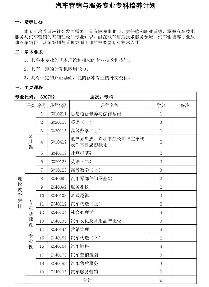 专科培养计划-专业代码:630702 汽车营销与服务专业