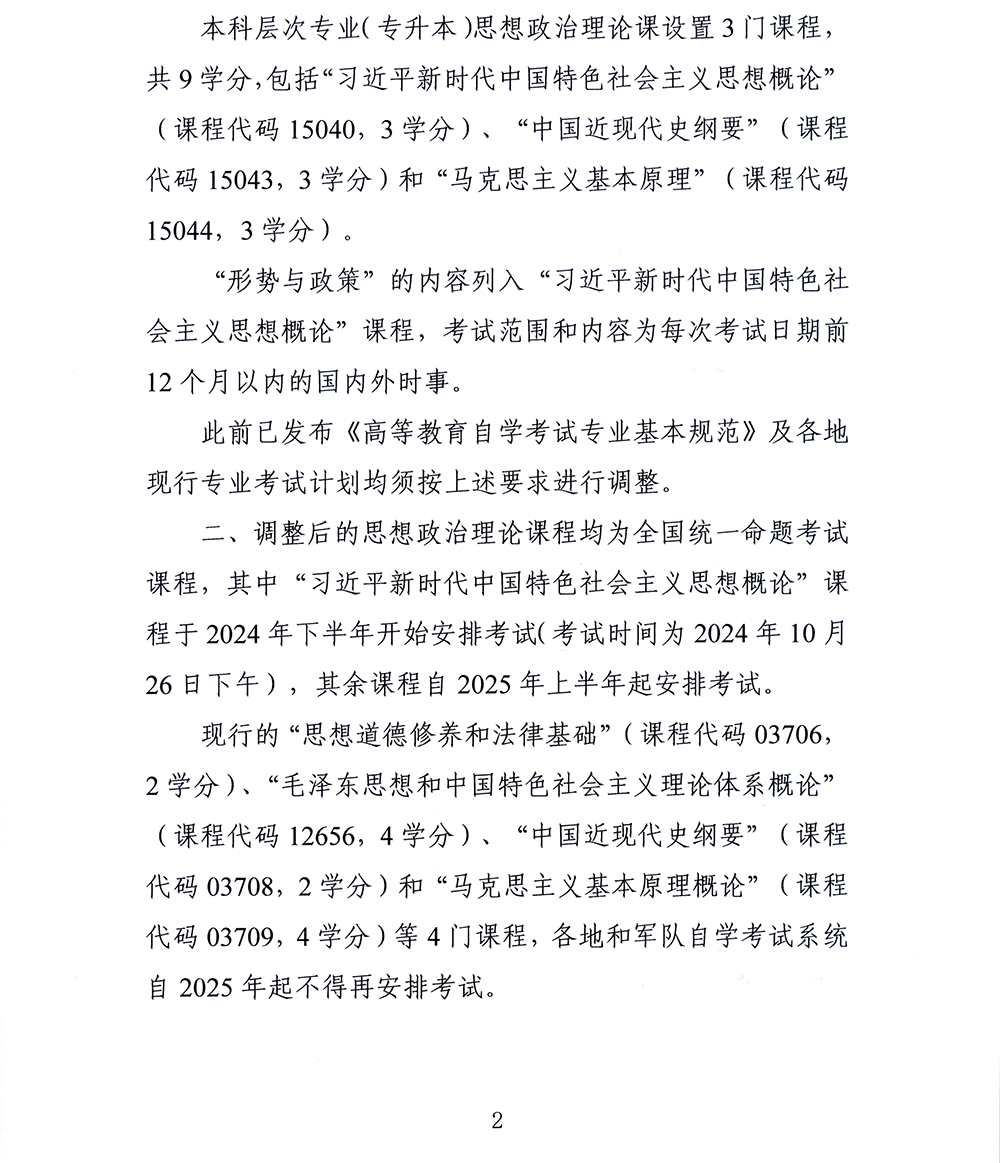 关于调整高等教育自学考试思想政治理论课课程设置的通知