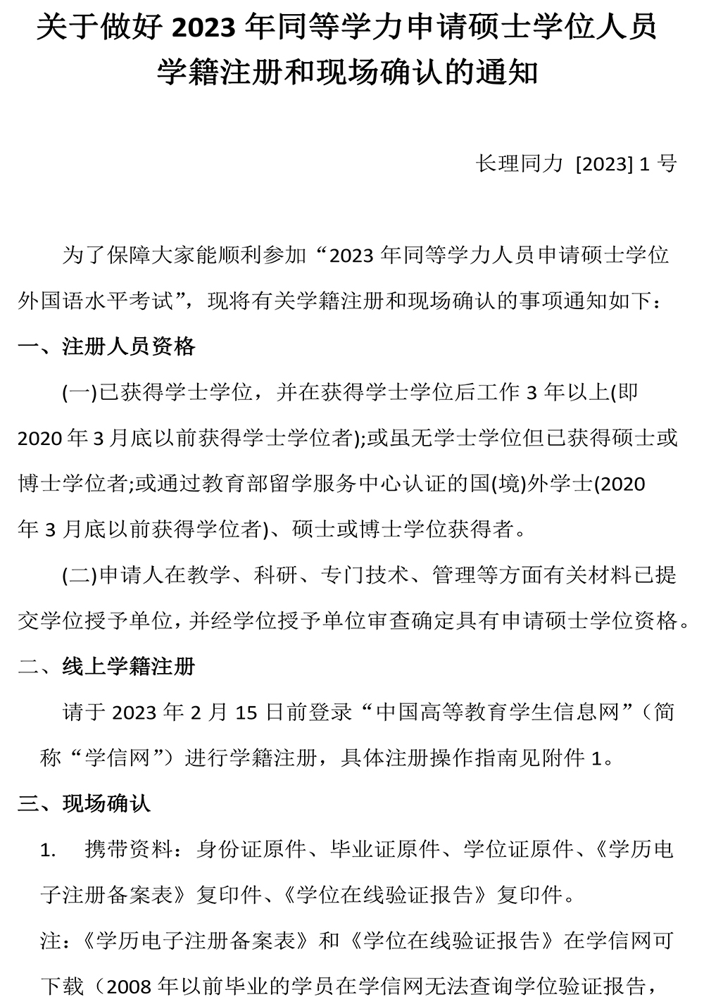 关于做好2023年同等学力申请硕士学位人员学籍注册和现场确认的通知