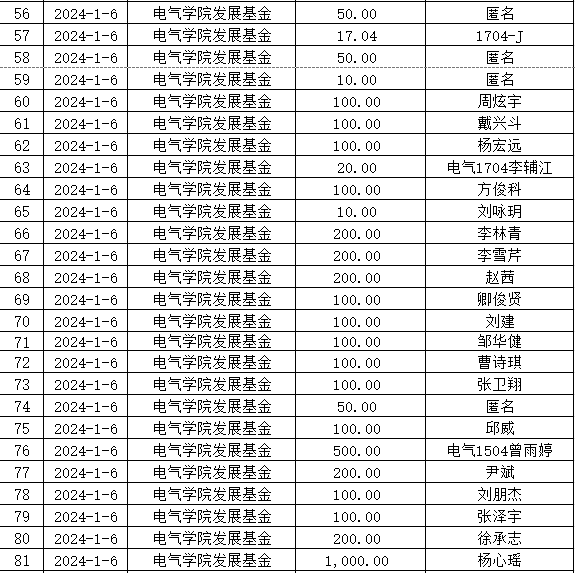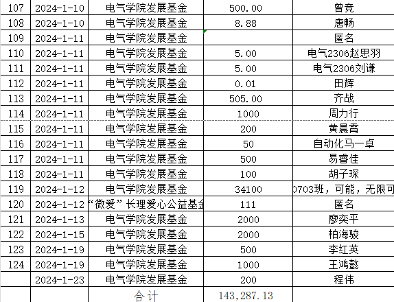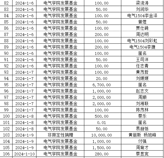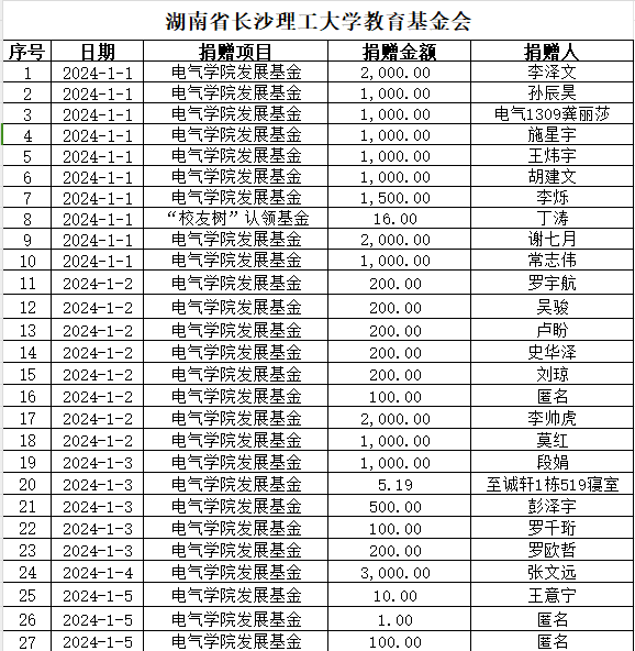 湖南省太阳成集团tyc122cc入口教育基金会2024年1月捐赠收入表