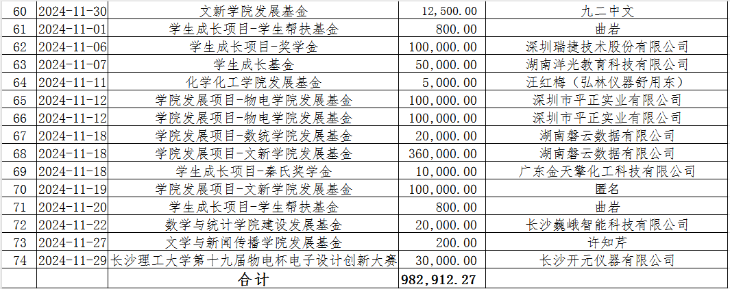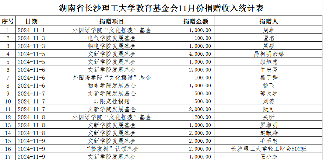 湖南省太阳成集团tyc122cc入口教育基金会2024年11月捐赠收入表