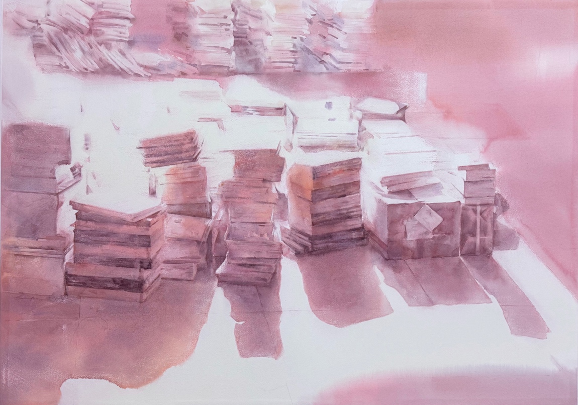作品《新学期·沐光而行》取材于春季开学期间建筑学院大厅中摆放的学生教材,成堆的书籍在阳光下焕发出美妙和谐的色彩,孕育着动人的青春活力。该作品充分运用水彩画本体语言的特性,用梦幻的色彩和简约的笔触作画,以一名教师的视角记述着画家的青春记忆。