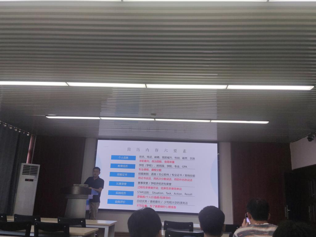 随后,王宇霖老师为学生们介绍了合格简历的基本结构,帮助学生缕清撰写简历的思路。他强调,要重视招聘单位的用人需求,从而把握好简历撰写的侧重点。