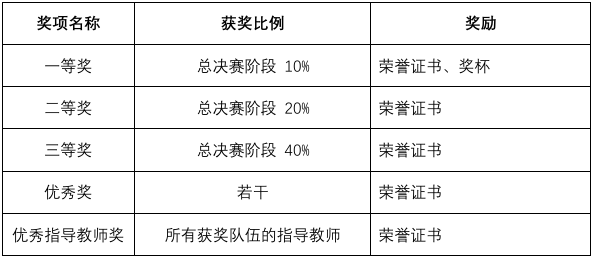 注: 1. 常规赛道本科组和专科组(含中职)分别进行评奖;2. 各模块单独进行评奖;3. 各模块总决赛奖项数量以总决赛实际参赛队伍总数为基数进行设定;4. 对参赛高校设立“最佳组织单位奖”若干,比例控制在参赛高校总数的10%以内;5. 对评审专家、指导教师和组织单位,设立“突出贡献奖”若干。