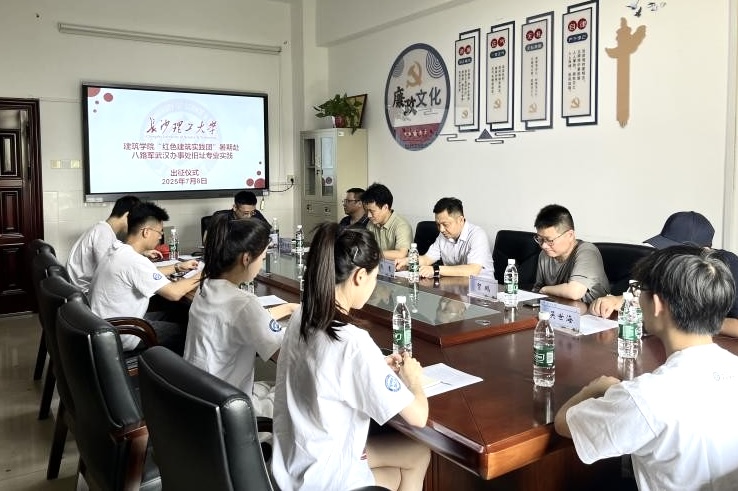 7月8日下午,建筑学院在金盆岭校区16号教学楼305室隆重举行“红色建筑实践团”研究生暑期实践出征仪式。该实践团将赴八路军武汉办事处旧址纪念馆开展调研实践。建筑学院党委书记熊鹰、副书记肖义慧,项目指导老师田长青、吴世海、贺鹏,学工办王宇霖老师及全体实践团成员出席仪式。