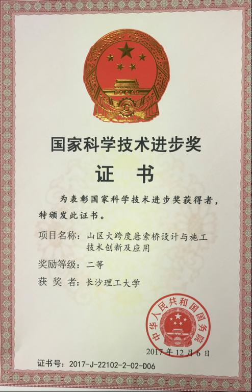 1月8日,中共中央、国务院在人民大会堂举行2017年度国家科学技术奖励大会,由湖南路桥建设集团有限责任公司、湖南省交通规划勘察设计院有限公司、湖南省高速公路建设开发总公司、西南交通大学、湖南大学、太阳成集团tyc122cc入口联合完成的《山区大跨度悬索桥设计与施工技术创新及应用》项目被授予国家科学技术进步奖二等奖。该项目以矮寨悬索桥为依托,对深切峡谷钢桁梁悬索桥结构体系、施工技术、抗风、抗震、隧道锚碇及边坡稳定性等方面展开了深入研究,取得了一系列创新成果。