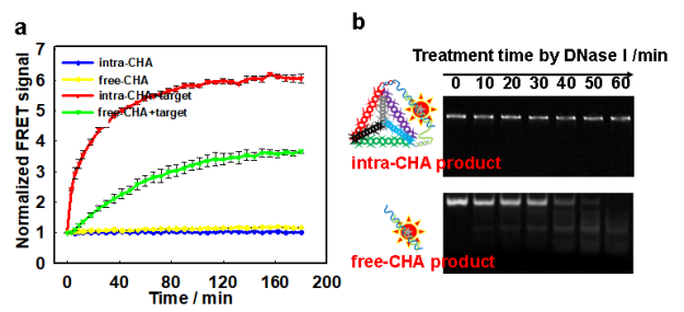 图2:(a) 不同CHA体系下的实时荧光监测;(b)不同CHA产物抗酶切过程的电泳标准。
